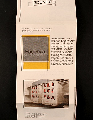 This is a double sided publication featuring snippets of advice from Leeds Metropolitan University's Visiting Lecturers from throughout the year; featuring designers & studios such as Mark Farrow, Troika, Graphic Thought Facility & more...